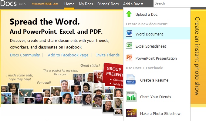 Docs.com is one more great application from Microsoft FUSE Labs which allows to create , edit and Open Microsoft Office files online. These office documents can further be Shared over Facebook also.