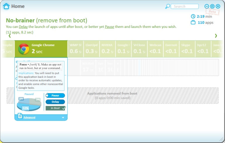 Soluto comes with an excellent Metro based interface and allows you review all items which starts at System Boot time and gives you suggestions to deal with each of them.